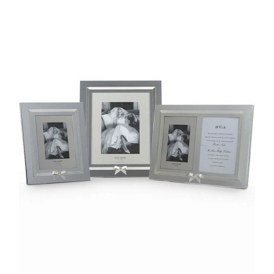 Wrap up fond memories with this frame by kate spade new york. These frame openings are bordered by a textured band resembling a grosgrain ribbon. And a sculpted bow adorns the bottom of the frame.