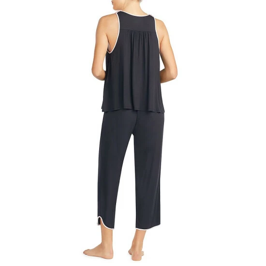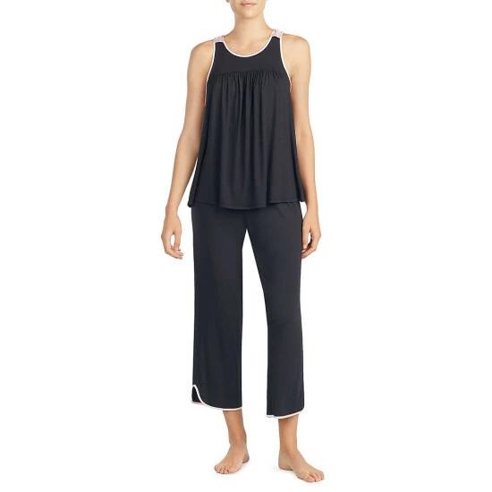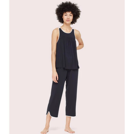 - Sleeveless top with contrast trim detail, round neckline, bow accents at shoulders & swing hem