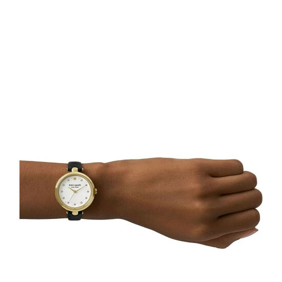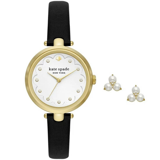 From kate spade new york, the Women’s Holland Three-Hand Black Leather Strap Watch and Stud Earrings Set features: